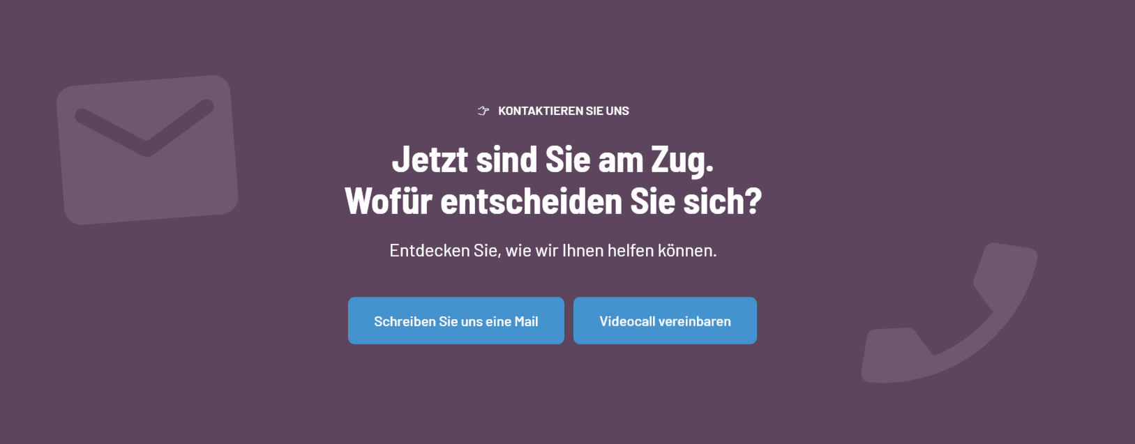 Kleur: gebruik de lichte kleurtinten voor grotere kleurvlakken met teksten. Met als enige uitzondering de primaire kleur paars (#5E455E). Deze kleur heeft een groot contrast met de doorgaans witte achtergronden, terwijl het wel rustig oogt. Gebruiken we bijvoorbeeld voor een CTA sectie op de website.