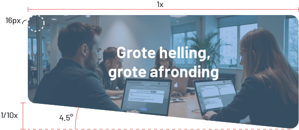 Helling: er zijn twee 'hellings-hoeken' mogelijk: 4.5° en 9°. Zo zorgen we voor consistentie in onze ontwerpen. Welke je gebruikt, hangt af van de grootte van het frame (groot frame → kleine helling). In principe is er altijd maar één scheve zijde. Anders oogt het al snel rommelig. Voor kleine ontwerpen - zoals op mobiel - kan je wel meerdere schuine zijdes gebruiken.