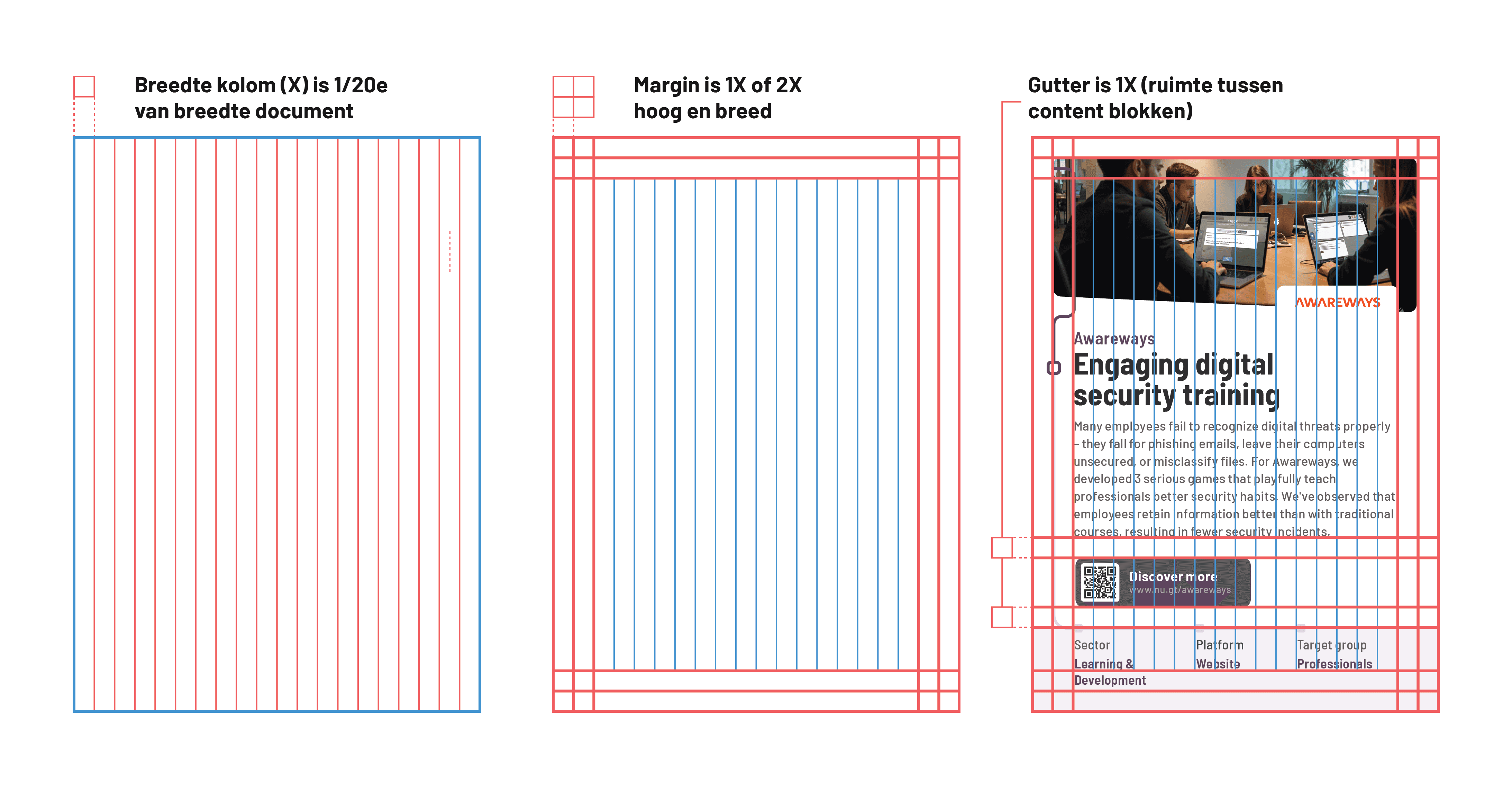 Voor onze geprinte materialen, gebruiken we gebruiken een standaard grid. Dit grid is gebaseerd op de breedte van het document (zie afbeelding hieronder). Door elementen consistent op dit grid te plaatsen, zorgen we voor rust en ritme.
